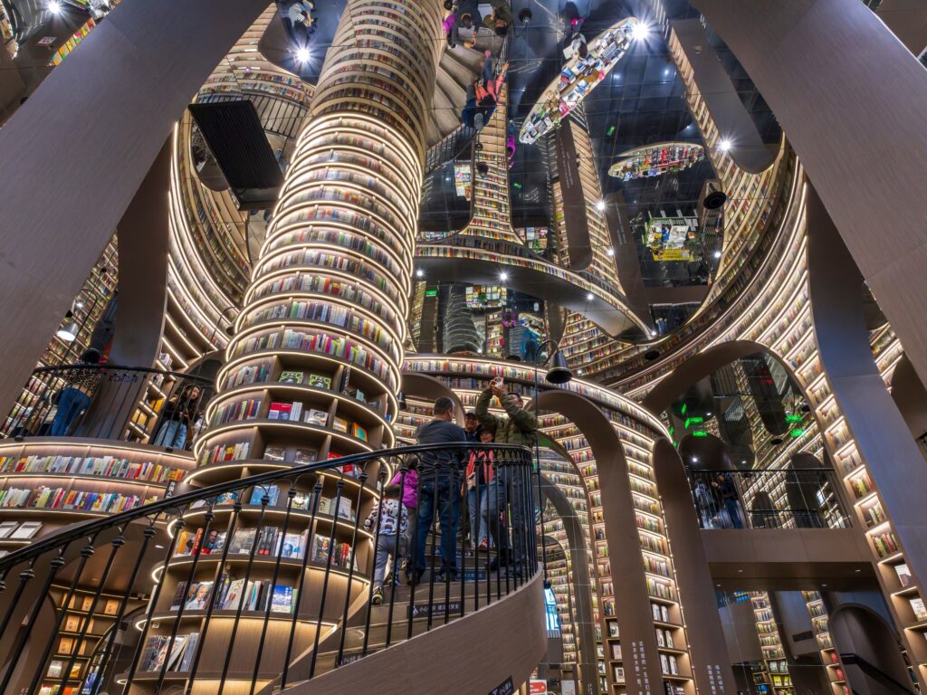 Como los dibujos de Escher, las escaleras aquí parecen no tener principio ni fin. Foto ShutterstockCon la capacidad de los reflejos para transformar los entornos multiplicándolos y creando ilusiones de infinitud y paisajes sinuosos a través de sus estantes curvos, esta librería china atrapa con una experiencia inmersiva e hipnotizante.