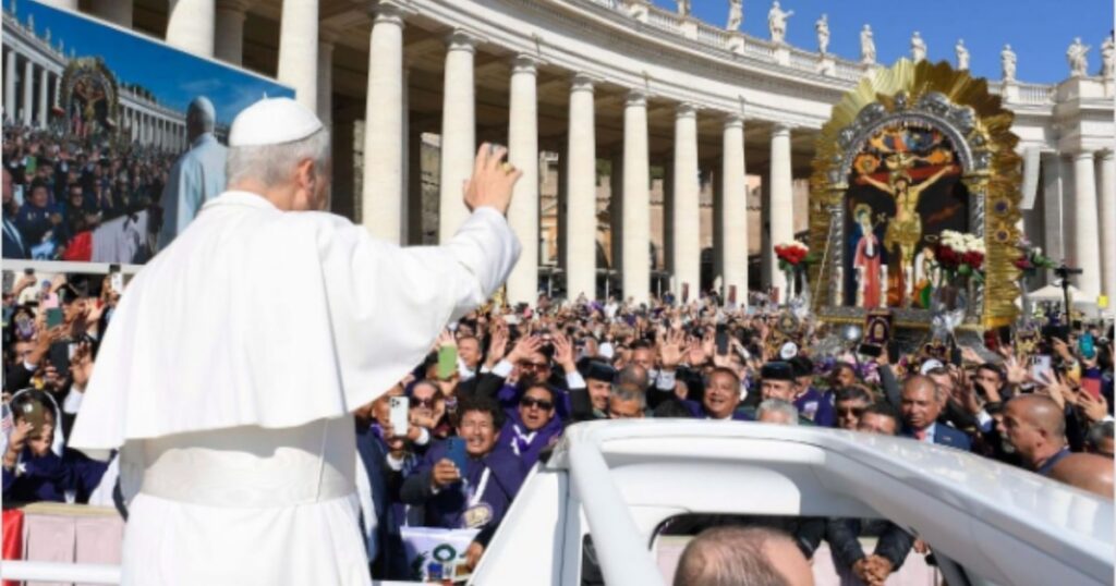 Al final de la Misa, el papa León XIV llegó a bordo del papamóvil hasta la zona de la Plaza de San Pedro en la que cientos de peruanos lo esperaron con una réplica de la imagen del Señor de los Milagros. En medio de la emoción de los presentes, el papa bendijo la imagen.